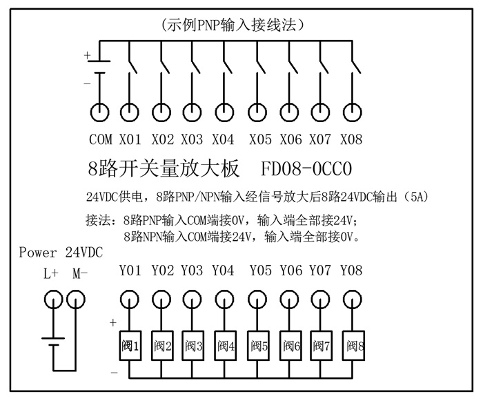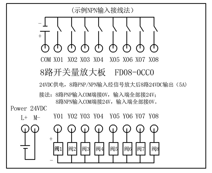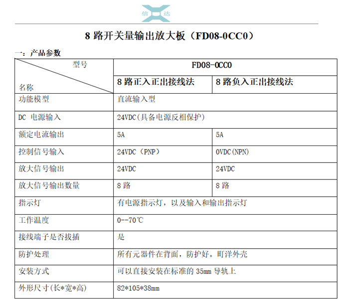FD08-0CC0开关量输出放大板可以将0.3A、0.5A或0.75A晶体管输出转换为5A晶体管输出,直接连接DC24V的电磁阀。具有没有机械触点,寿命长,切换快等特点;且有短路、过流、过压等保护!放大板上有两排指示灯,上面一排是输入信号指示灯,下面一排是输出信号指示灯,可以很明了的知道信号的输入输出。