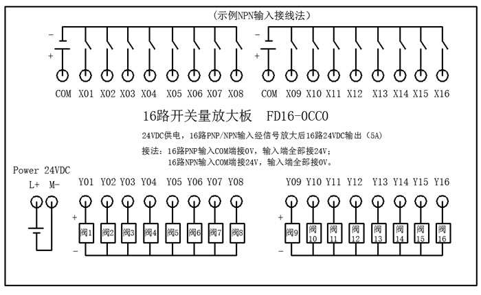 FD16-0CC0开关量输出放大板可以将0.3A、0.5A或0.75A晶体管输出转换为5A晶体管输出,直接连接DC24V的电磁阀。具有没有机械触点,寿命长,切换快等特点;且有短路、过流、过压等保护!放大板上有两排指示灯,上面一排是输入信号指示灯,下面一排是输出信号指示灯,可以很明了的知道信号的输入输出。